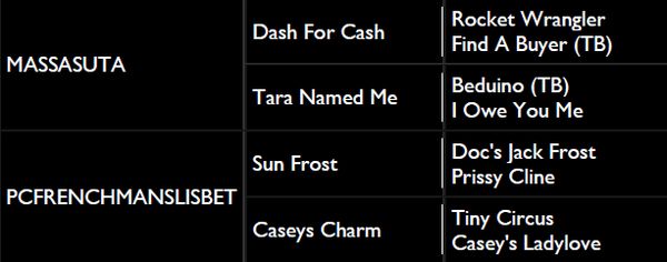 Frenchmans Izzy is a daughter of the great producing broodmare PCFRENCHMANLISBET a full sister to barrel horse greats Bozo and Pc Frenchmans Hayday( sire of Stingray). Izzy was one of the most talented two year olds Frenchman Quarter horses have started. Granddam Casey's Charm is the dam to Bozo, to PC Frenchmans Hayday (the sire of Stingray), and leading barrel sire Frenchmans Fabulous.